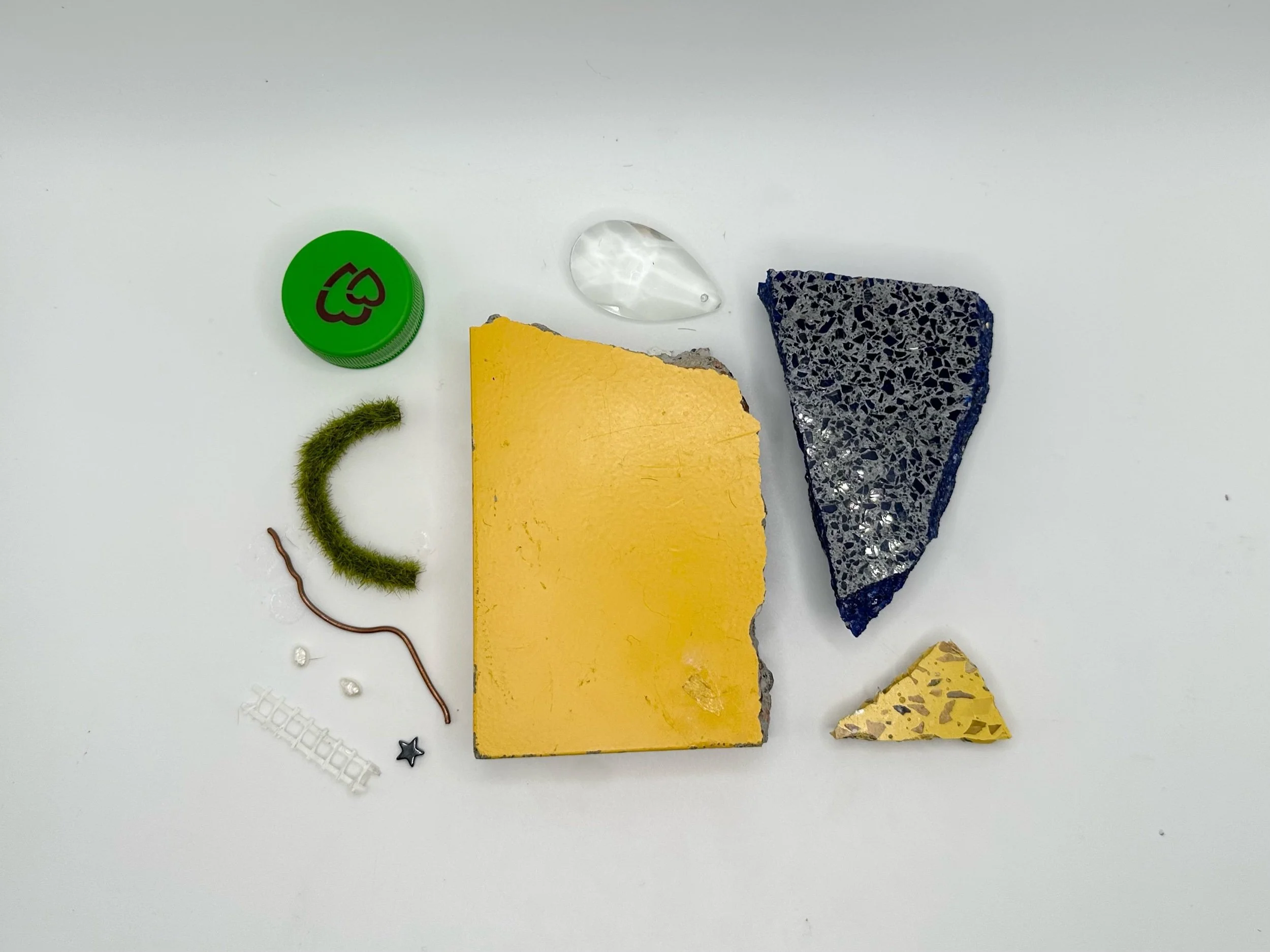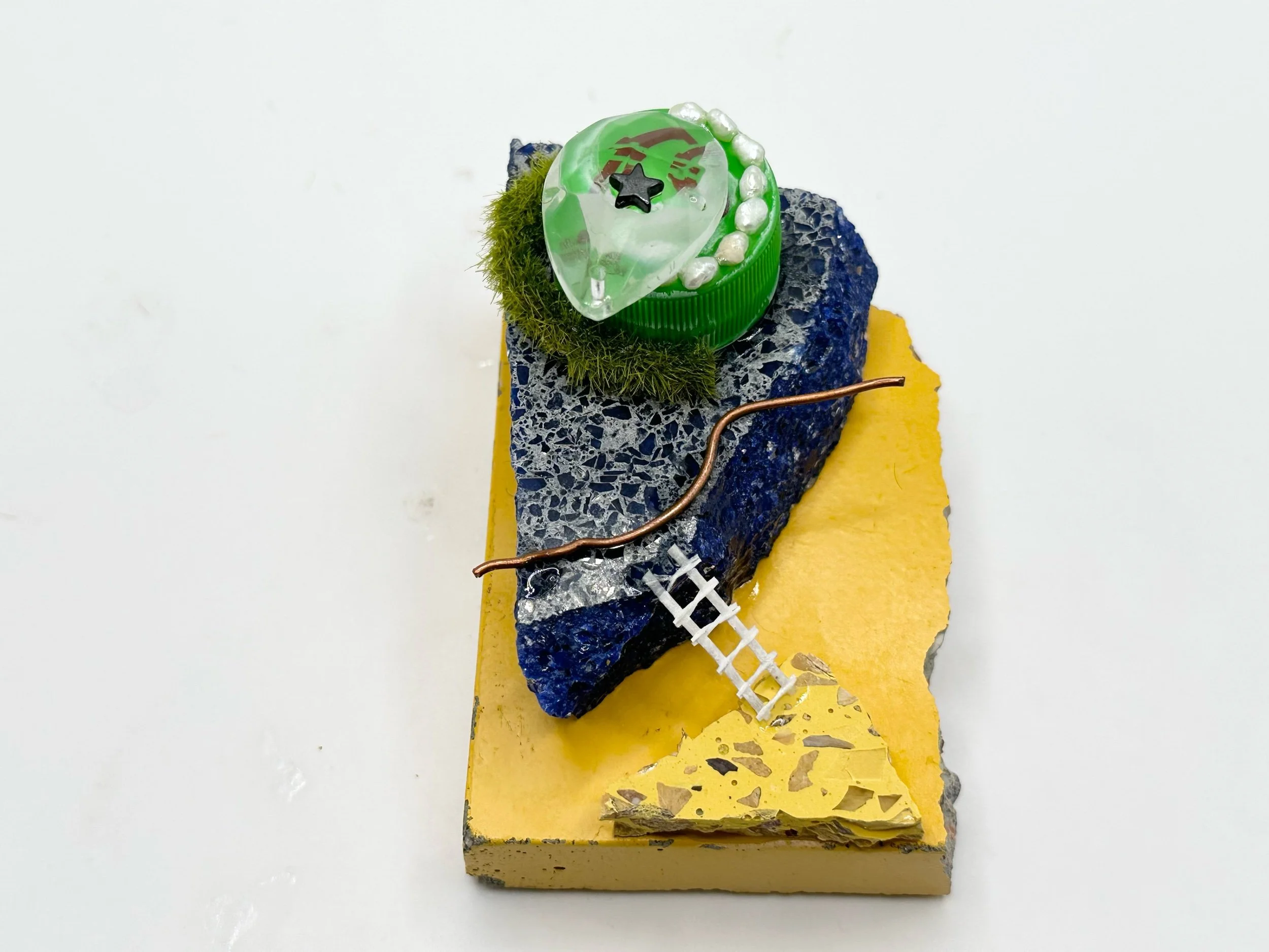 This material translation has evolved to include miniature toys, miscellaneous jewels, textile samples, and other objects representative of both (a) a timeline of a transforming psyche and (b) the devalorization of materials once something has become broken, or singular, or used or discarded. This body of work questions capitalistic value and repositions a melee of found objects into representative monuments erected to reflect the fantasy of building The American Dream.”