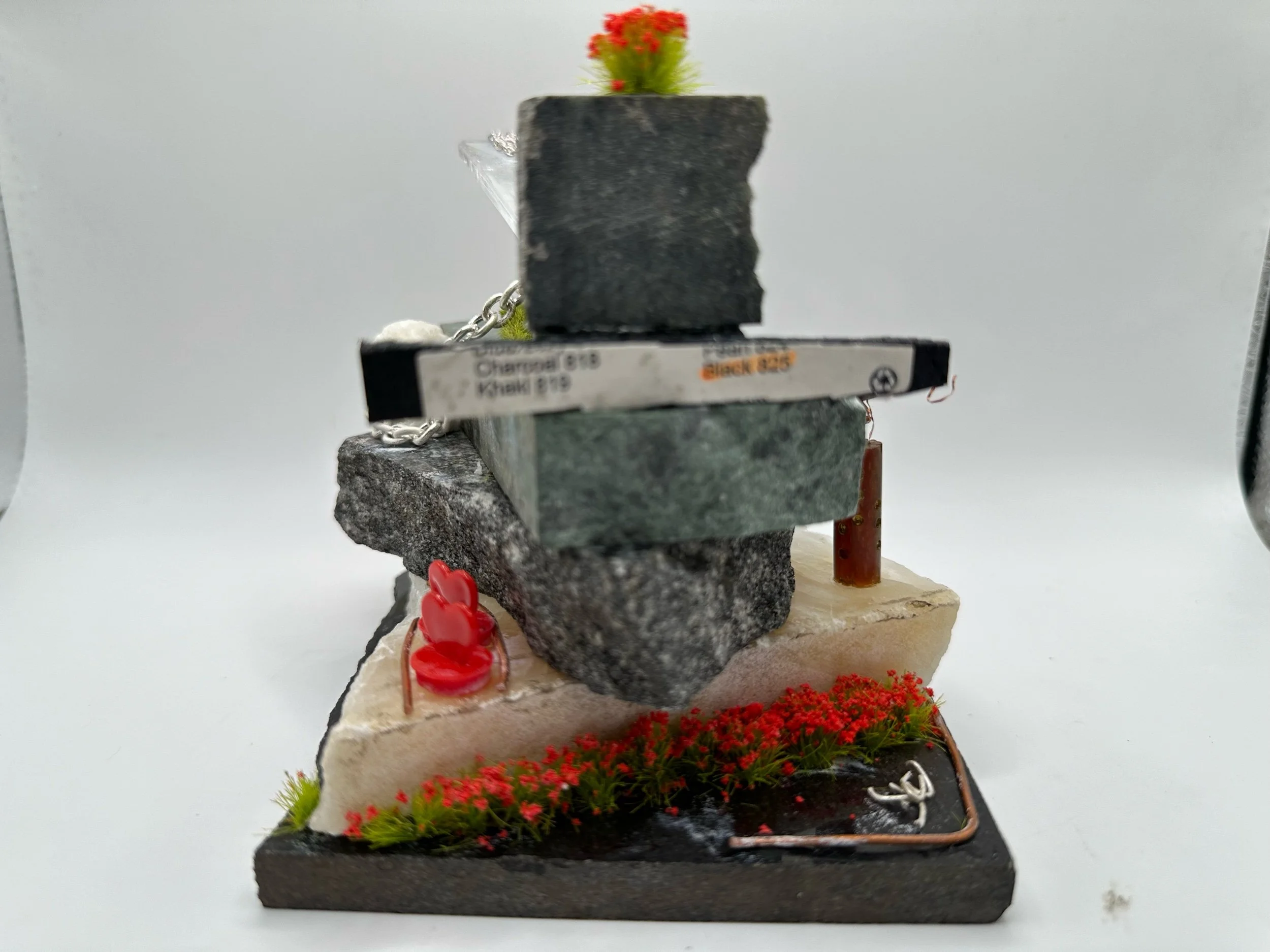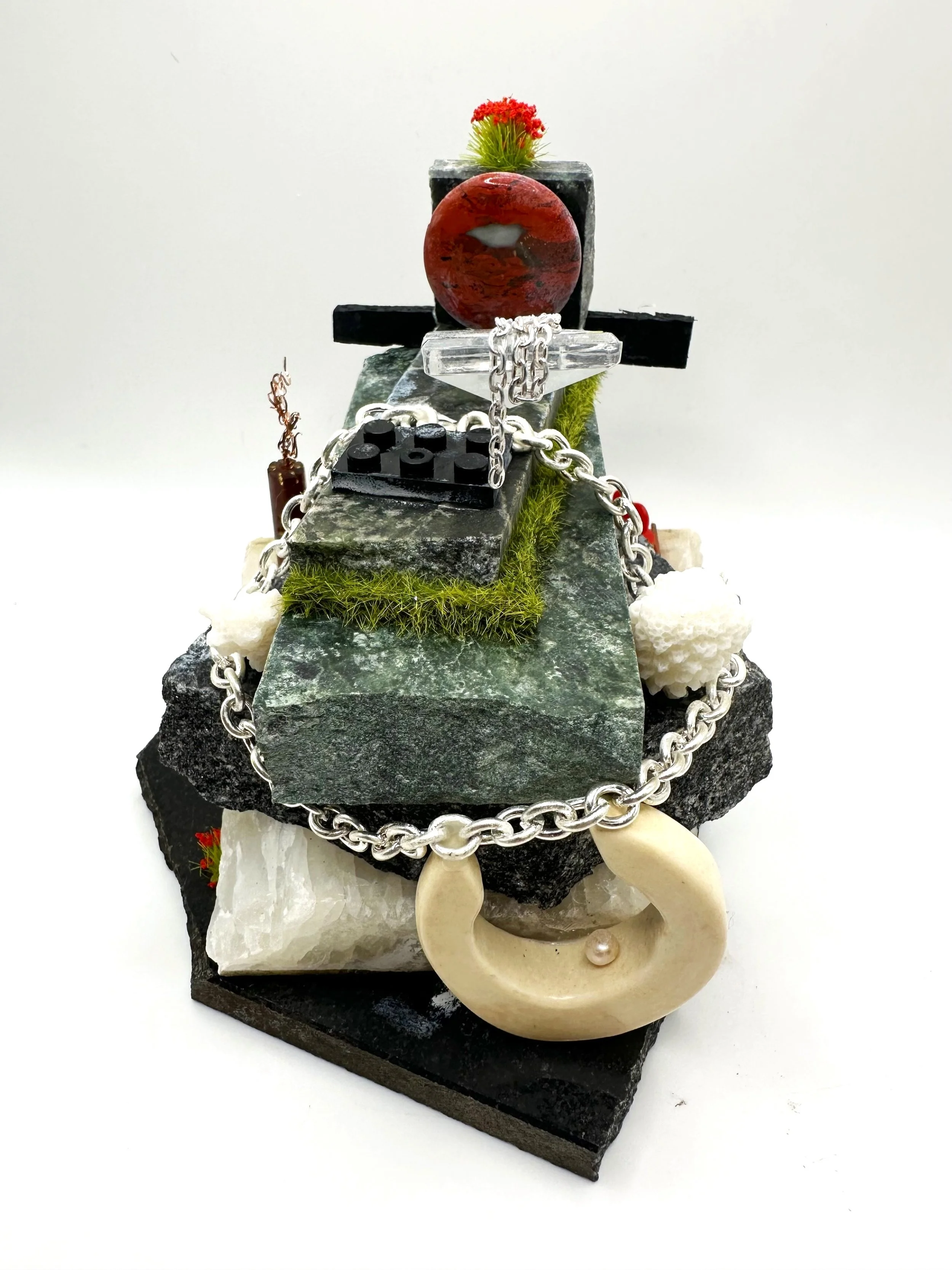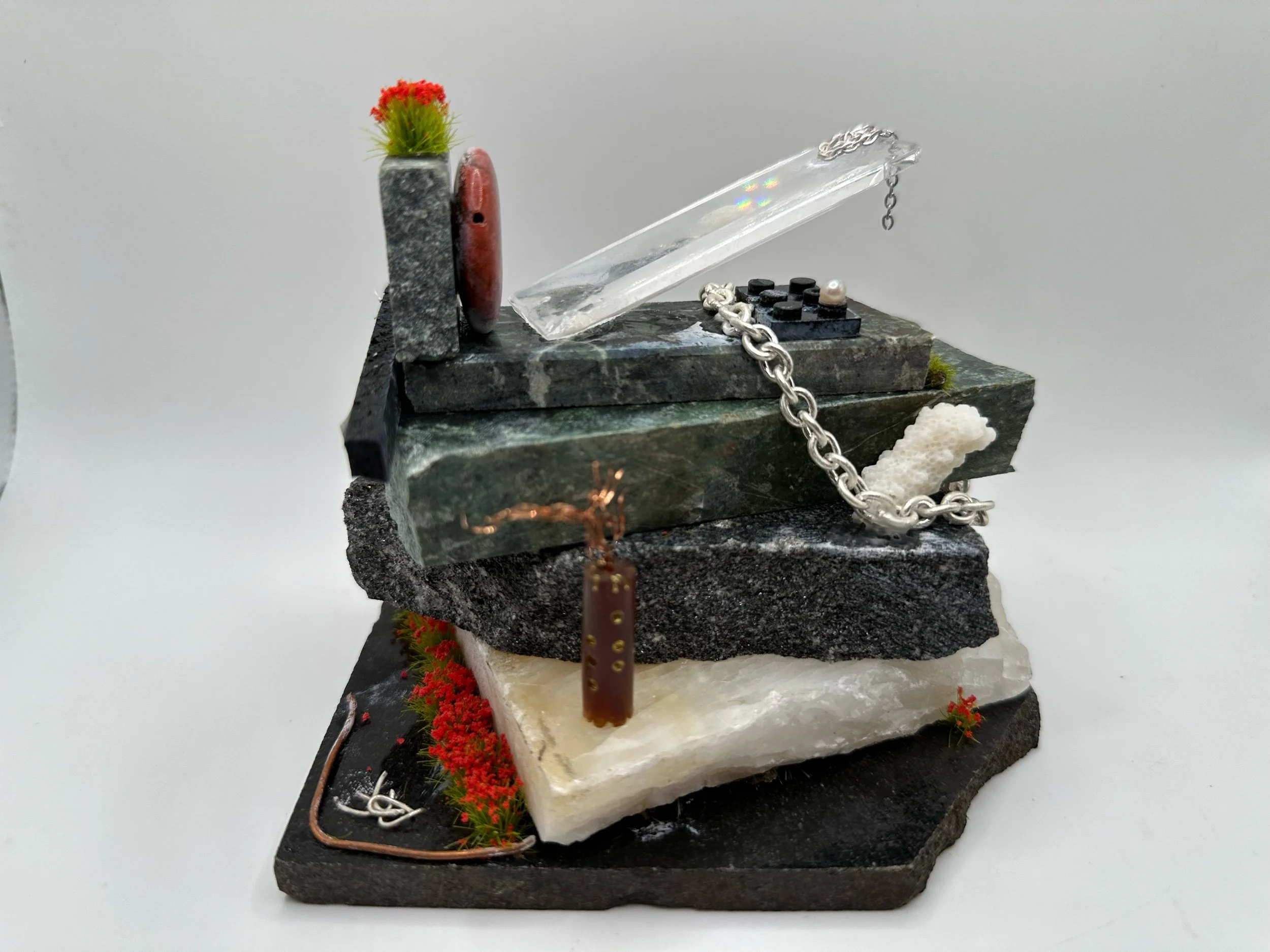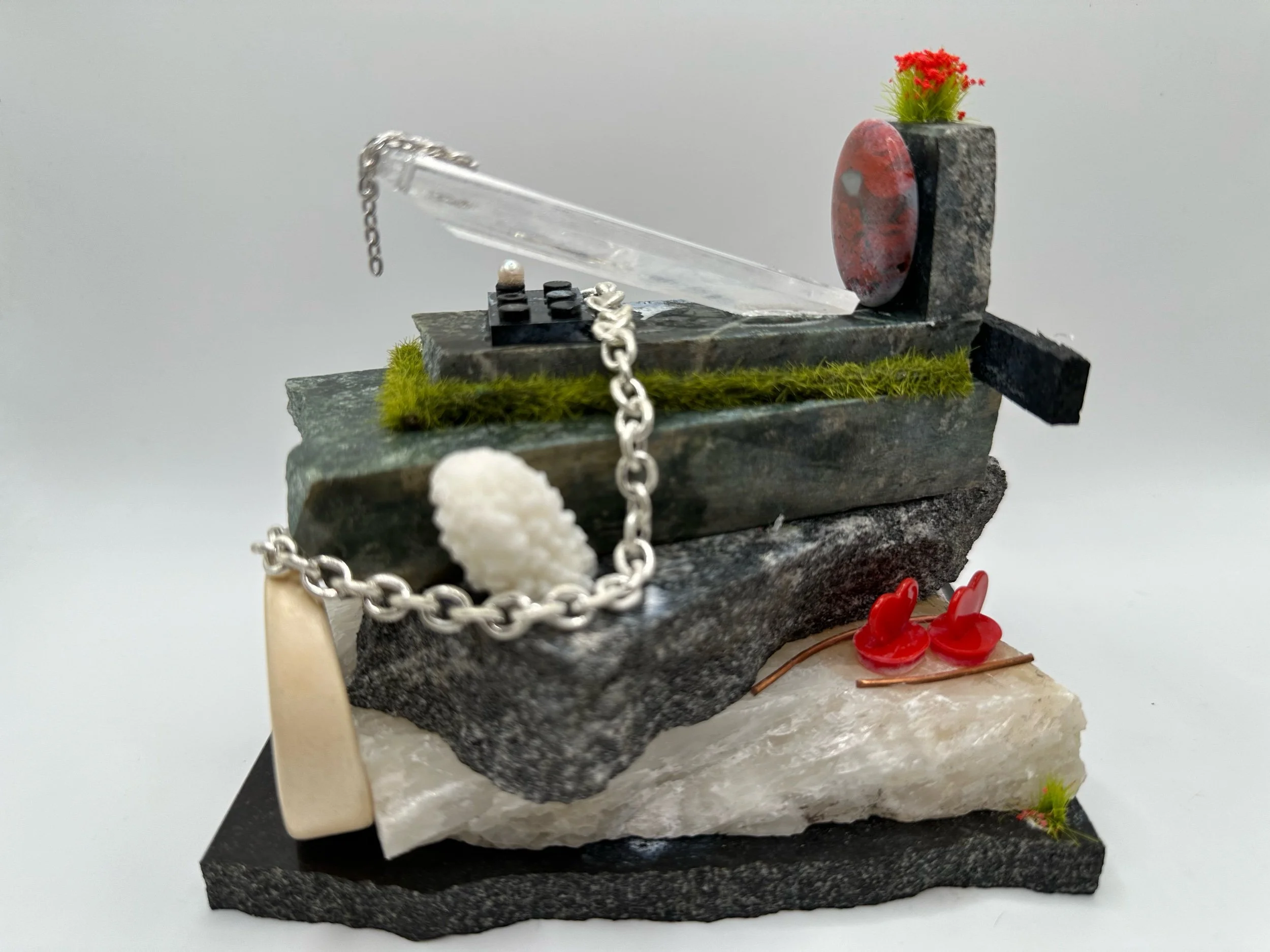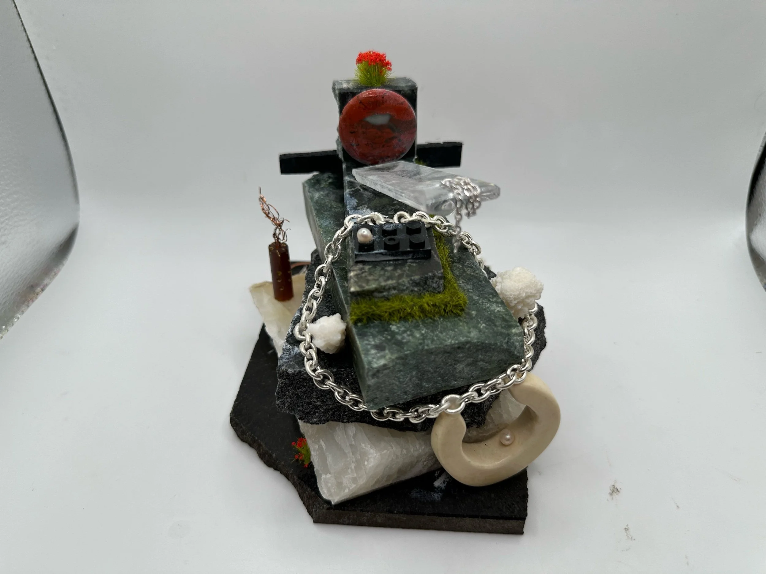 Broken granite, broken tile, textile sample, faux grass, chain, drink stoppers, bone, chain, bleached coral, Brillo pad, red ocean jasper, copper wire, pearl, faux flowers.